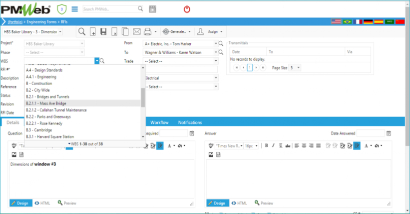 Engineering Forms Todos   os   documentos   que   necessários   para   gerenciar   projetos,   em   um   revolucionário   design   para   Web.   Drag   & Drop para Relatórios diários e Punch lists; Criar relatórios em Rich Text Format sem sair do PMWeb; Vincular registros múltiplos agrupados para uma referência rápida; Colar do MS Word sem perda de formatação; Atribuir documentos aos calendários dos usuários; Mesclar para o MS Word, Excel ... • RFIs • Envios • Minutas de reunião • Listas de desenho • Conjuntos de desenho • Relatórios diários • Punch List • Transmissões • Itens de ação • Relatórios RTF